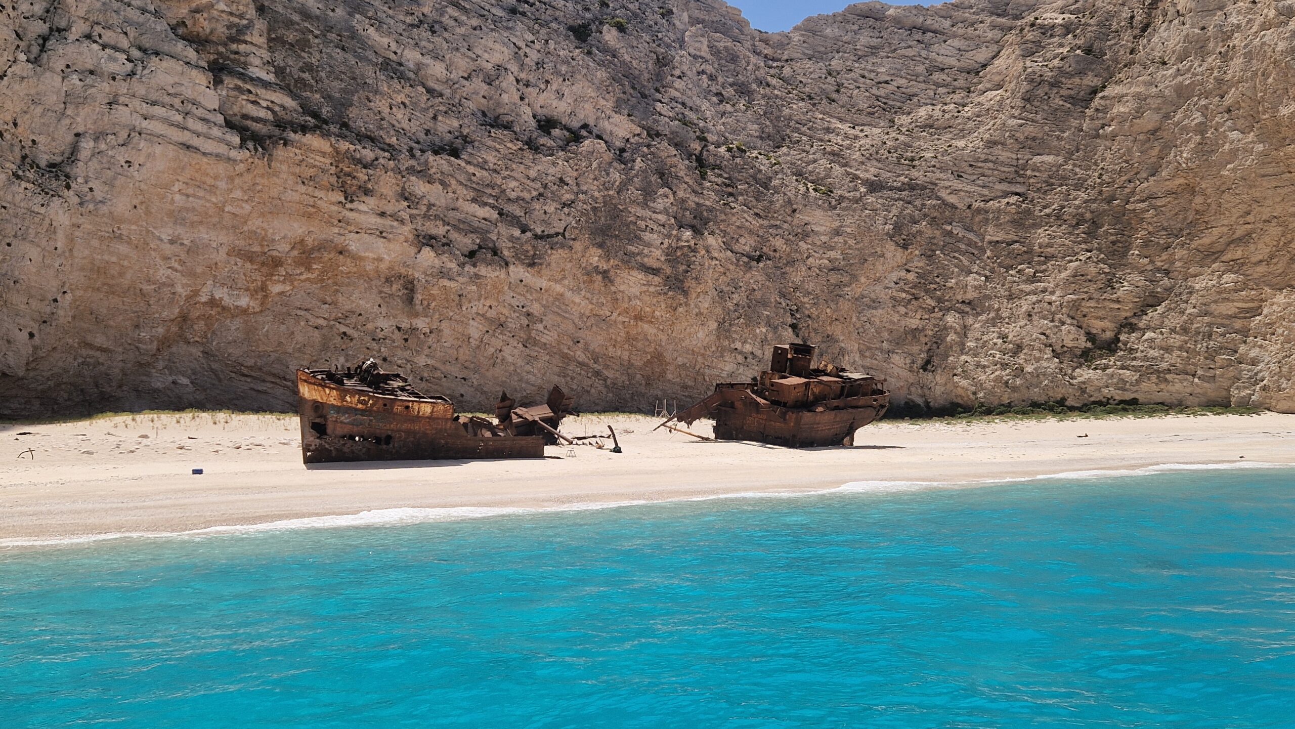 Navagio – plaża w Zatoce Wraku uznawana jest za jedną z najpiękniejszych na świecie! Można się o tym przekonać, podziwiając niesamowity błękit morza kontrastujący z białymi ścianami wapiennych, dwustumetrowych klifów. Dopełnieniem tego majestatycznego widoku jest wrak, owianego legendą, statku przemytniczego. Rejs do Zatoki Wraku to też niezapomniana okazja, aby zobaczyć wyjątkowe formacje skalne wybrzeża wyspy Zakynthos. Podczas rejsu do Zatoki Wraku podpływamy do plaży Navagio na odległość ok. 50m (przystanek na zdjęcia) – będziecie mieć okazję zobaczyć z pokładu statku charakterystykę klifowego wybrzeża Zatoki Navagio